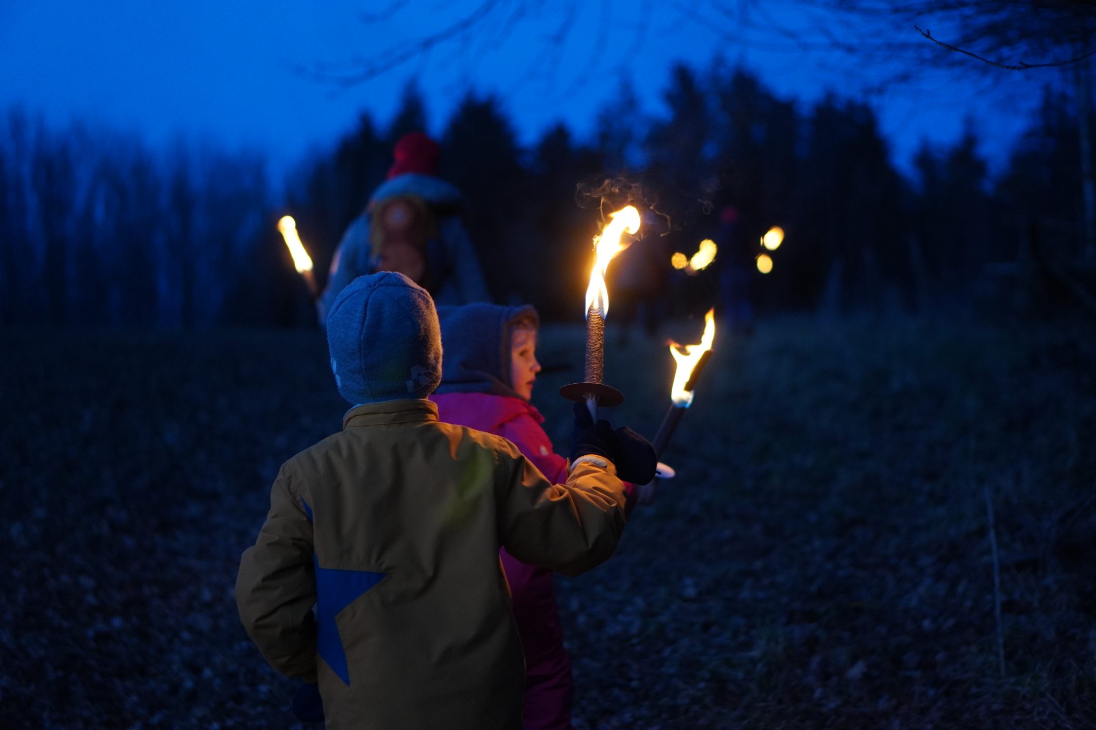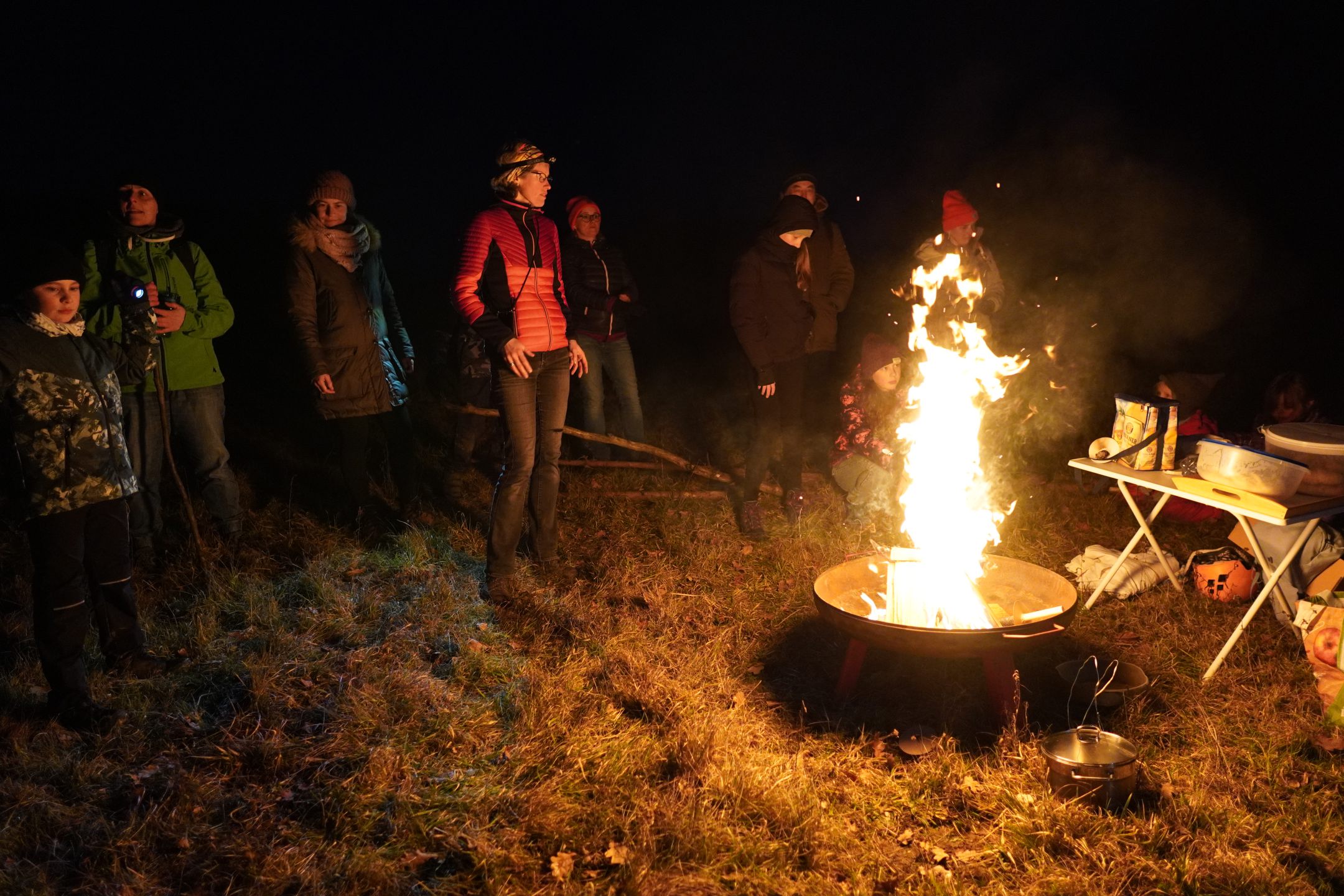 Tierspuren auf matschigen und feuchten Wegen konnte man an diesem Tag besonders gut entdecken. Wir erreichten eine Lichtung und rasteten hier für eine halbe Stunde oder die unternehmungslustigen Teilnehmer nahmen am Laufspiel Fuchs und Hase teil. Die Hasen versteckten sich im Wald oder zwischen den Brombeerbüschen, aber wurden geschwind von den schnellen Füchsen gefangen. Mit Einsetzen der Dämmerung schnappte sich jedes Kind eine Fackel. Diese leuchtende Karawane schlich sich weiterhin entlang dem Waldrand, durch die Felder zurück zum Ausgangspunkt. Hier trafen sich alle in letzter Runde zum Aufstellen eines selbst gebauten Dreibeins. Zudem wärmte das Lagerfeuer, an dem die Kinder begierig das Stockbrot auf ihre geschnitzten Stecken wickelten oder hungrig nach einen Hotdog mit heißem Würstchen griffen. Während das letzte Tageslicht erlosch und die Temperatur rapide sank, eröffnete der Himmel sein weites und beeindruckendes Sternenmeer.