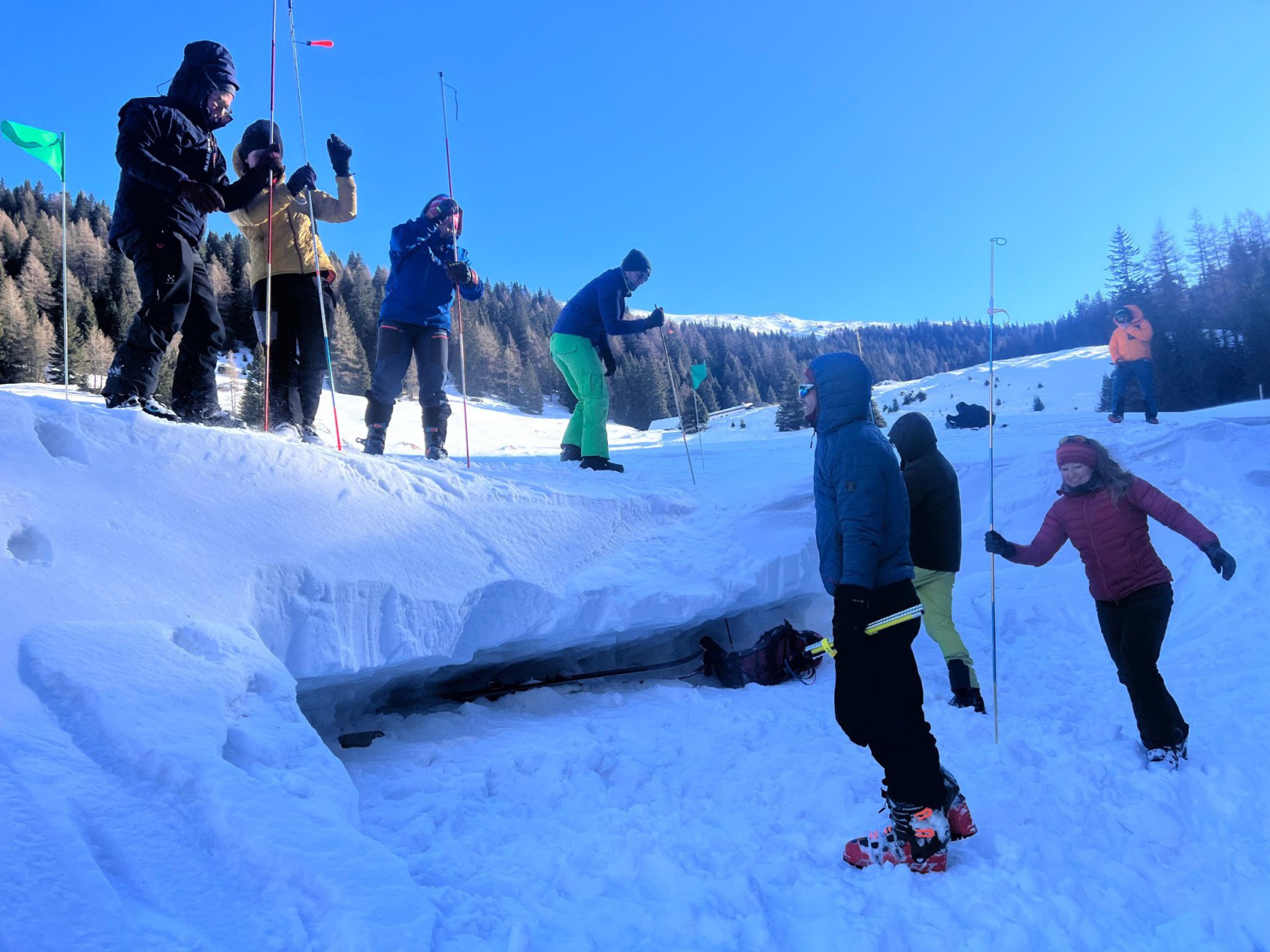 Im Gegensatz zu den meisten Lawinenkursen ging es nicht um das Vermeiden von Lawinen, sondern die Abläufe sollte es doch einmal zum Schlimmsten kommen. Die Kooperation mit der Sektion Mainburg sichert nicht nur ausreichend Teilnehmer, sondern auch noch kompetente Verstärkung für unseren Trainer C „Skibergsteigen“ Udo Weißflog in Person von Bertram Pfaller und Markus Zottmaier (Sektion Mainburg). In spontaner, aber stets strukturierter Weise verpassten die drei Trainer uns einen Intensiv-Waschgang im Umgang mit unseren LVS-Geräten, den Suchphasen in der Verschüttetenortung und in der Versorgung der gängigsten Verletzungsmuster. In einem sehr dicht gepackten Wochenende mit 3 Praxistagen und 2 Theorieabenden (1 davon mit Einblicken in den Alltag als Bergretter durch die Profis der lokalen Bergrettung) konnten alle Teilnehmer - ob mit oder ohne Vorkenntnisse - ihr Bewusstsein für die Abläufe und Routinen schärfen und in verschiedenen realistischen Szenarien anwenden. Besonders spannend war für alle der Einfluss der Gruppendynamik auf das eigene Verhalten in einer extremen Stresssituation. Am Ende können alle in der bunten Truppe einen Rucksack voll praktischer Erkenntnisse, spaßigen Erinnerungen und neuen Tourenpartnern mitnehmen.