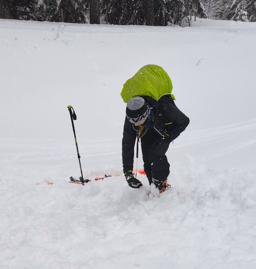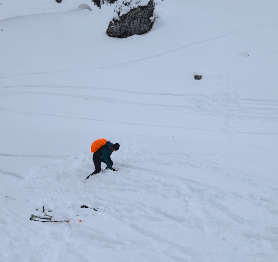 Gleich zu Beginn standen grundlegende Ausbildungsinhalte im Fokus. In windgeschütztem, aber stark verschneitem Gelände führten wir eine LVS-Übung durch. Dabei konnten alle den Umgang mit dem Verschüttetensuchgerät praktisch trainieren und Sicherheit im Ablauf gewinnen.