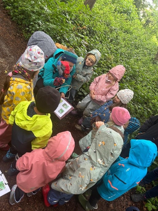 Verschiedene Rätsel mussten auf dem Weg gelöst werden zum Beispiel bestimmte Blätter finden, Tierrätsel lösen oder die verschiedenen Farben des Waldes entdecken. Auch ein paar Spiele waren mit im Gepäck. Auf dem Weg wurde dann auch noch eine Dachshöhle erkundet. Trotz gelegentlichen Regen liefen alle Kinder tapfer bergauf und bergab. Am Ende gab es dann den Schatz mit einer kleinen Belohnung.