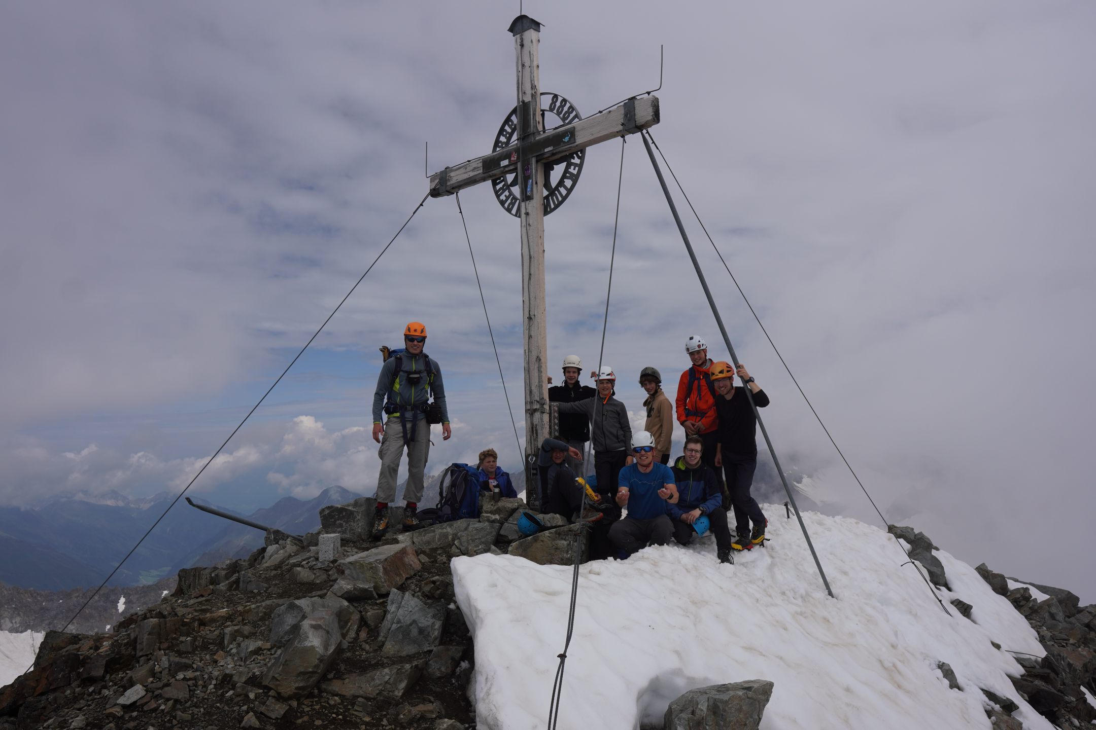 7 Jugendliche sind am Wochenende mit einem Jugendleiter und einem Hochtourentrainer der Sektion auf ihrem ersten ausgewachsenen Berg gewesen. Nach der spaßigen Anreise mit dem Vereinsbus ging es für die unter 15 jährigen, zwei davon sogar unter 12 Jahre, zunächst zur Amberger Hütte. Das uneindeutige Wetter permanent im Blick stieg die Gruppe dann in deutlich über 1300hm über den Westgrat auf den Gipfel des Schrankogel.