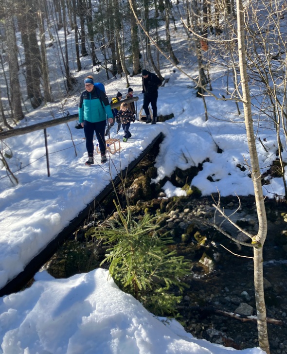 Am Sonntag, den 8. Februar trafen sich vier Familien zu einem Rodelausflug im Mangfallgebirge unweit dem Tegernsee. 10 Kinder im Alter von 4 bis 14 Jahren und 6 Erwachsene starteten um 10:30 Uhr vom Parkplatz kurz hinter Wildbad Kreuth mit Zipfelbobs, Holzschlitten und Sportrodel im Schlepptau. Ein langsam aufsteigender Wanderpfad schlängelte sich rund 4km entlang dem Schwarzenbach in einer wunderschön leuchtenden Schneelandschaft hoch zur Schwarzentenn-Alm.