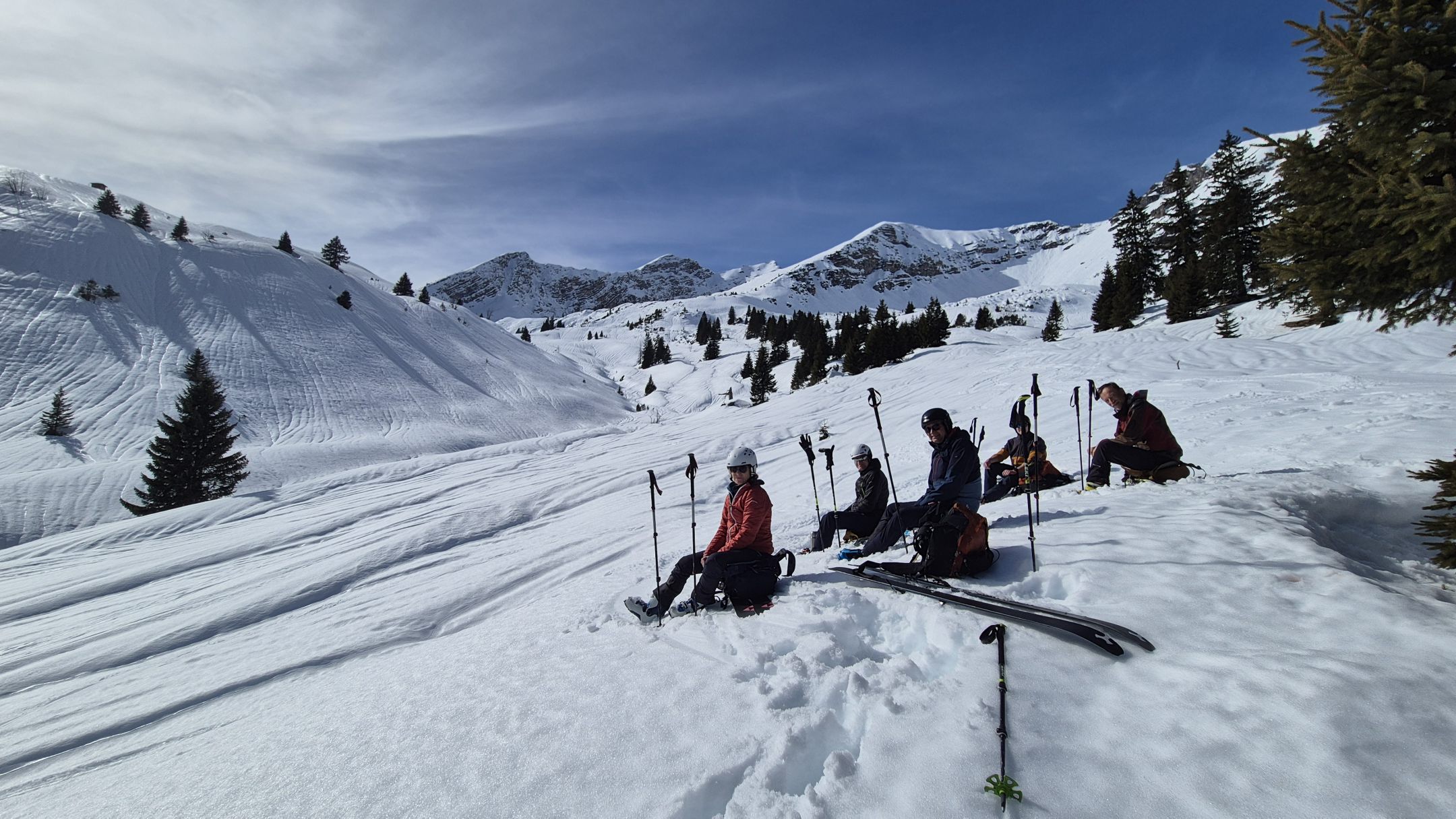 Am Sonntag stand neben dem Tourenerlebnis auch der Ausbildungsaspekt im Mittelpunkt. An der Krinnenspitze im Tannheimer Tal nutzten wir neblige Bedingungen gezielt für ein Training zur Spuranlage im Gelände. Dabei konnten verschiedene Techniken ausprobiert und gemeinsam reflektiert werden – eine wertvolle Erfahrung für zukünftige Touren.
