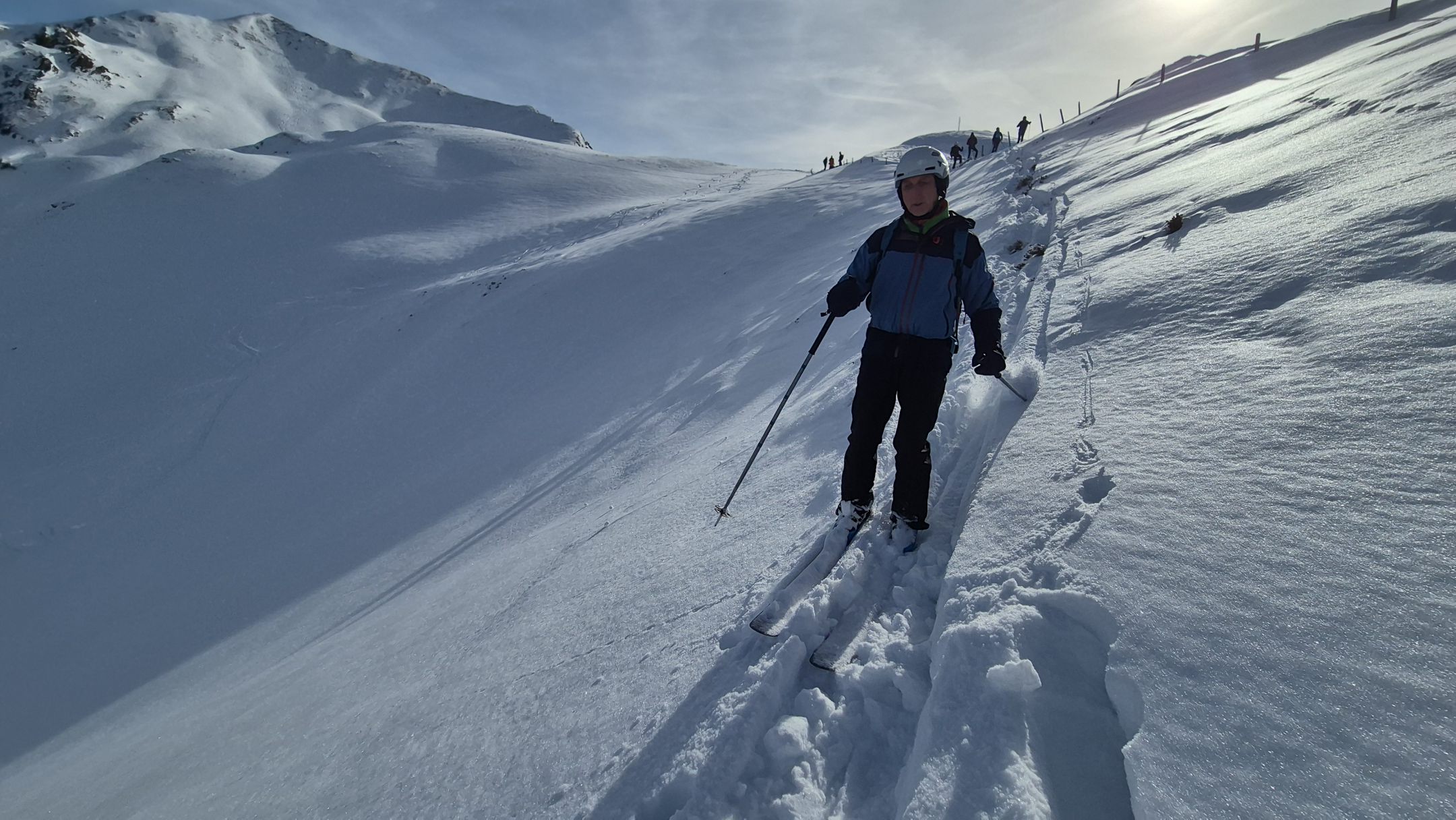 Neben dem sportlichen Erlebnis lag ein klarer Schwerpunkt auf der Lawinenkunde. Gemeinsam beschäftigten wir uns mit dem Lawinenlagebericht, der Interpretation von Gefahrenstufen und der Übertragung auf das konkrete Gelände. Unterwegs wurden immer wieder Stopps eingelegt, um Entscheidungen zur Spurwahl, Hangneigung und Exposition bewusst zu diskutieren.