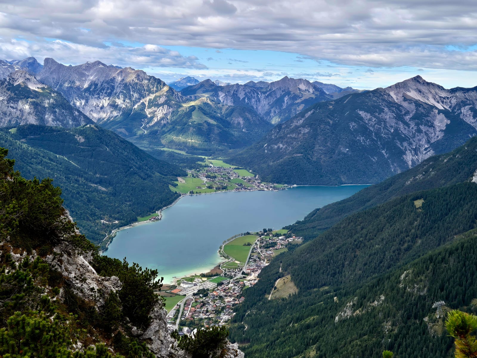 Einen tollen Blick auf die Rofangipfel, hoch über dem Inntal und unten der Achensee,