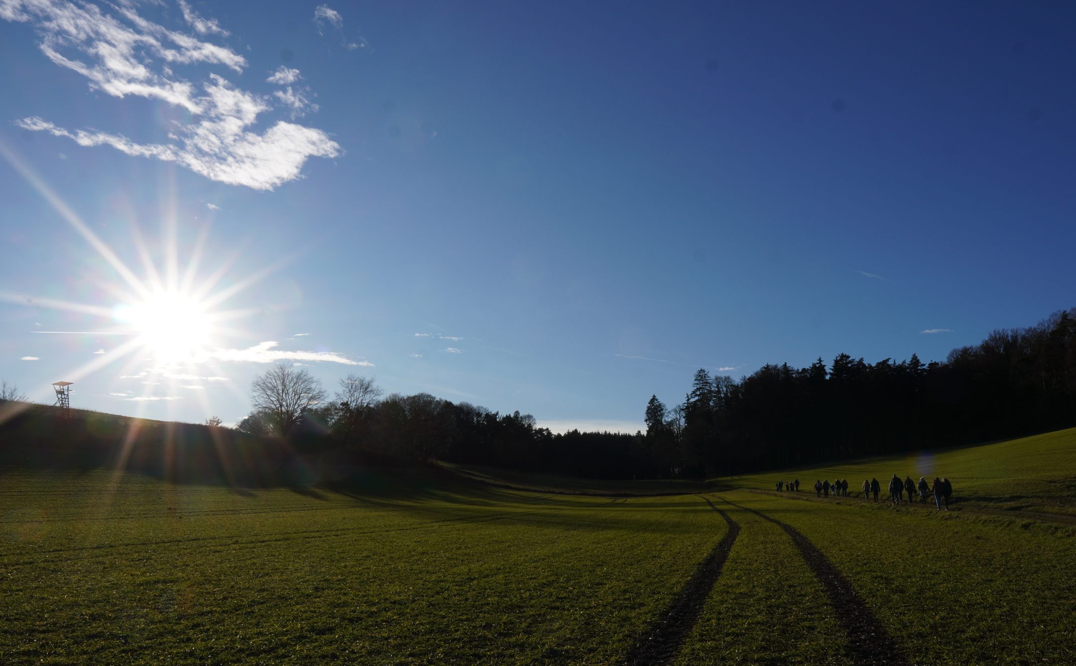 Die insgesamt 13 Kinder (4-14 Jahre) durften sich überlegen, wie sie am liebsten voranschreiten möchten: mit geschlossenen Augen einen Erwachsenen führend, im Hopserlauf oder wie ein Känguruh hüpfend den Hügel hinauf. Stetig ging es bergauf und bergab. So abseits der Wohnsiedlungen entdeckten die aufgeweckten Kinder einen hoppelnden Hasen, eine vorbeihuschende Feldmaus oder ganz wachsame Rehe. Die Gruppe ließ vielseitge Landschaftsbilder hinter sich und streifte durchs Geäst, entlang von schmalen Waldpfaden oder durch abgeholzte Waldstücke.