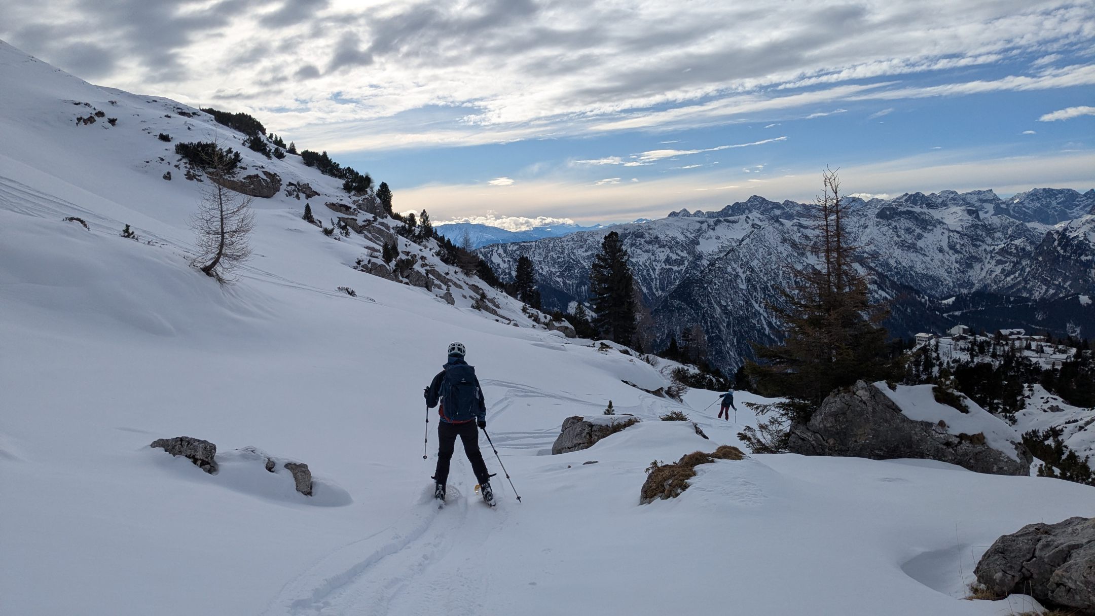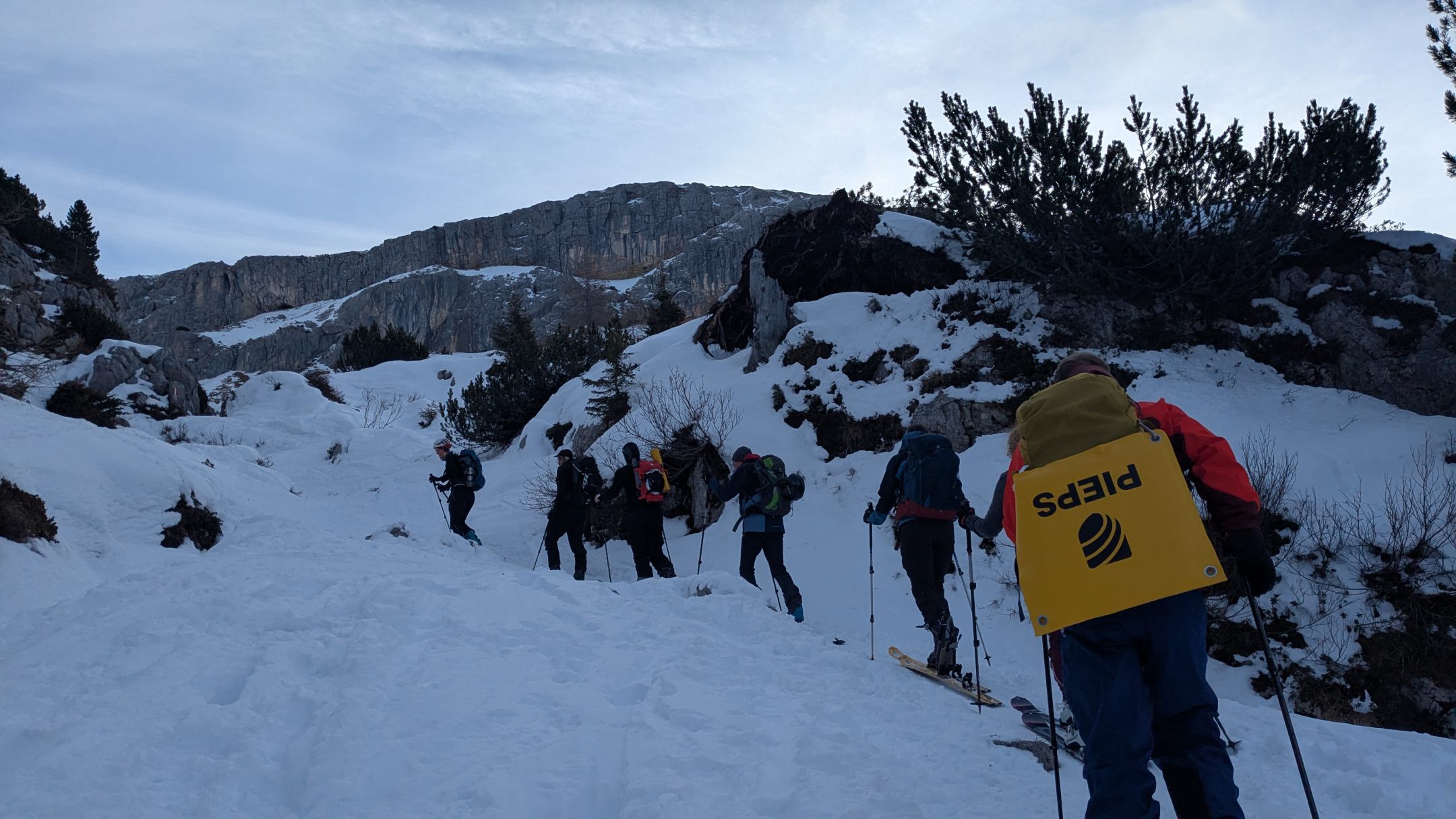 Ein Schwerpunkt des Wochenendes war das 3×3 des Lawinenrisikomanagements, das sowohl in der Tourenplanung als auch unterwegs im Gelände intensiv trainiert wurde. Die Teilnehmenden lernten, relevante Faktoren strukturiert zu bewerten und sichere Entscheidungen zu treffen. Praktisch umgesetzt wurde das Gelernte bei Skitouren:
