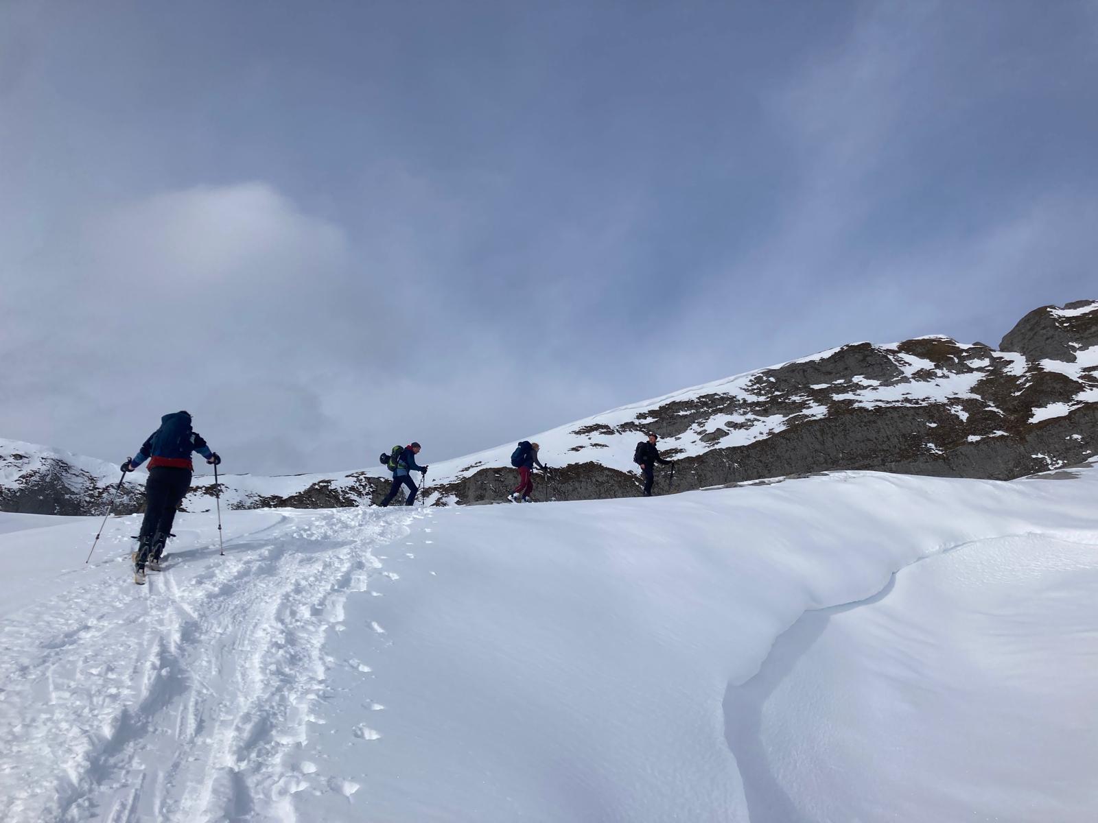 In einer motivierten und wissbegierigen Gruppe mit 7 Teilnehmenden wurden durch die Guides der Sektionen Burghausen und Pfaffenhofen zentrale Inhalte der Lawinenkunde vertieft und direkt im Gelände angewendet – ergänzt durch Skitouren und praxisnahe LVS-Übungen. Vordringliches Ziel war die Vorbereitung aller Teilnehmenden auf die aktuell sehr komplexen Lawinenzeiten im gesamten Alpenraum.