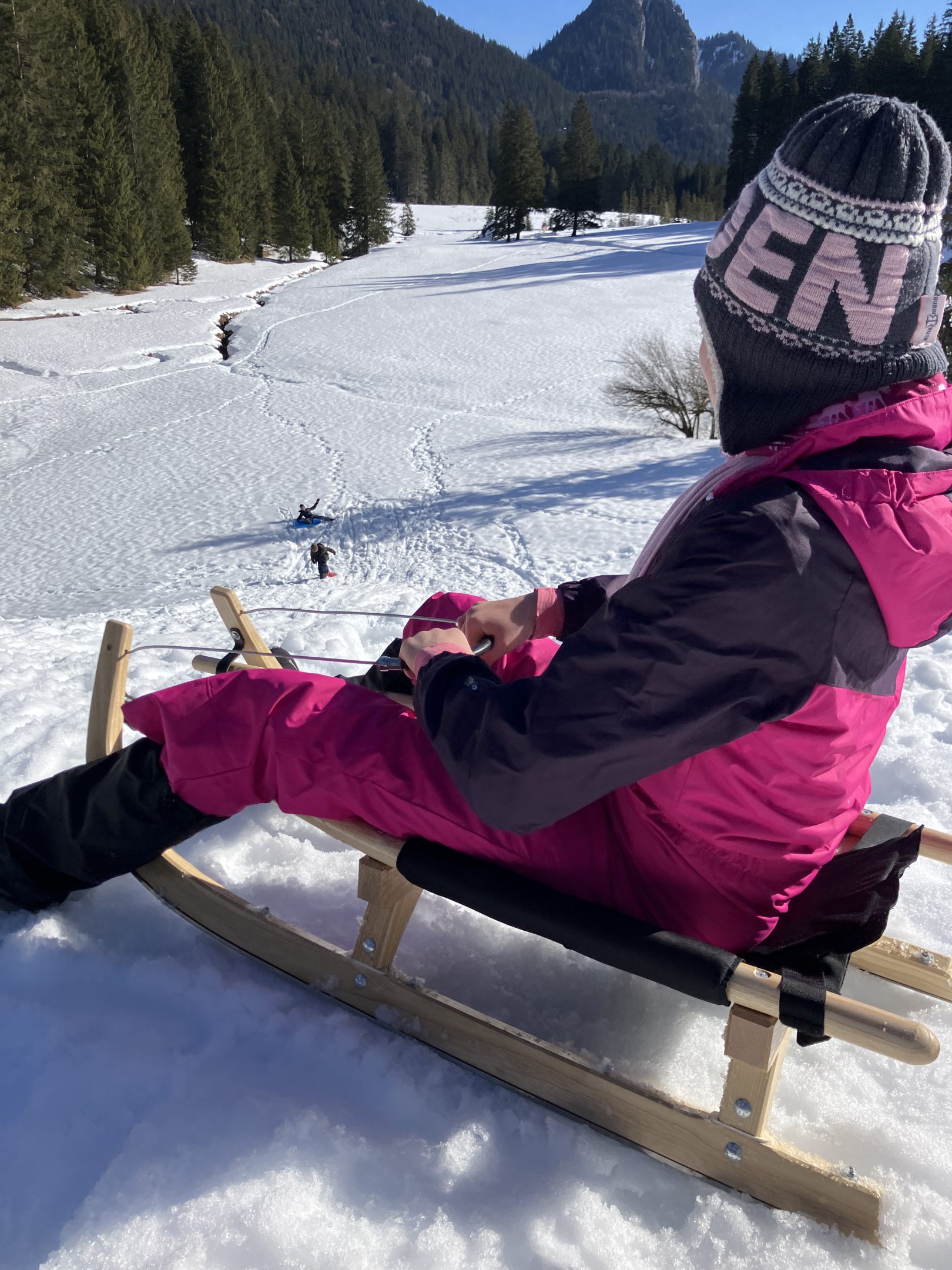 Nach etwa 200 Höhenmetern bot ein Hügel, neben der auf 1.027m hoch gelegenen Alm, ideale Rodelbedingungen mit einer steilen Abfahrt und weicher Landung im Tiefschnee.