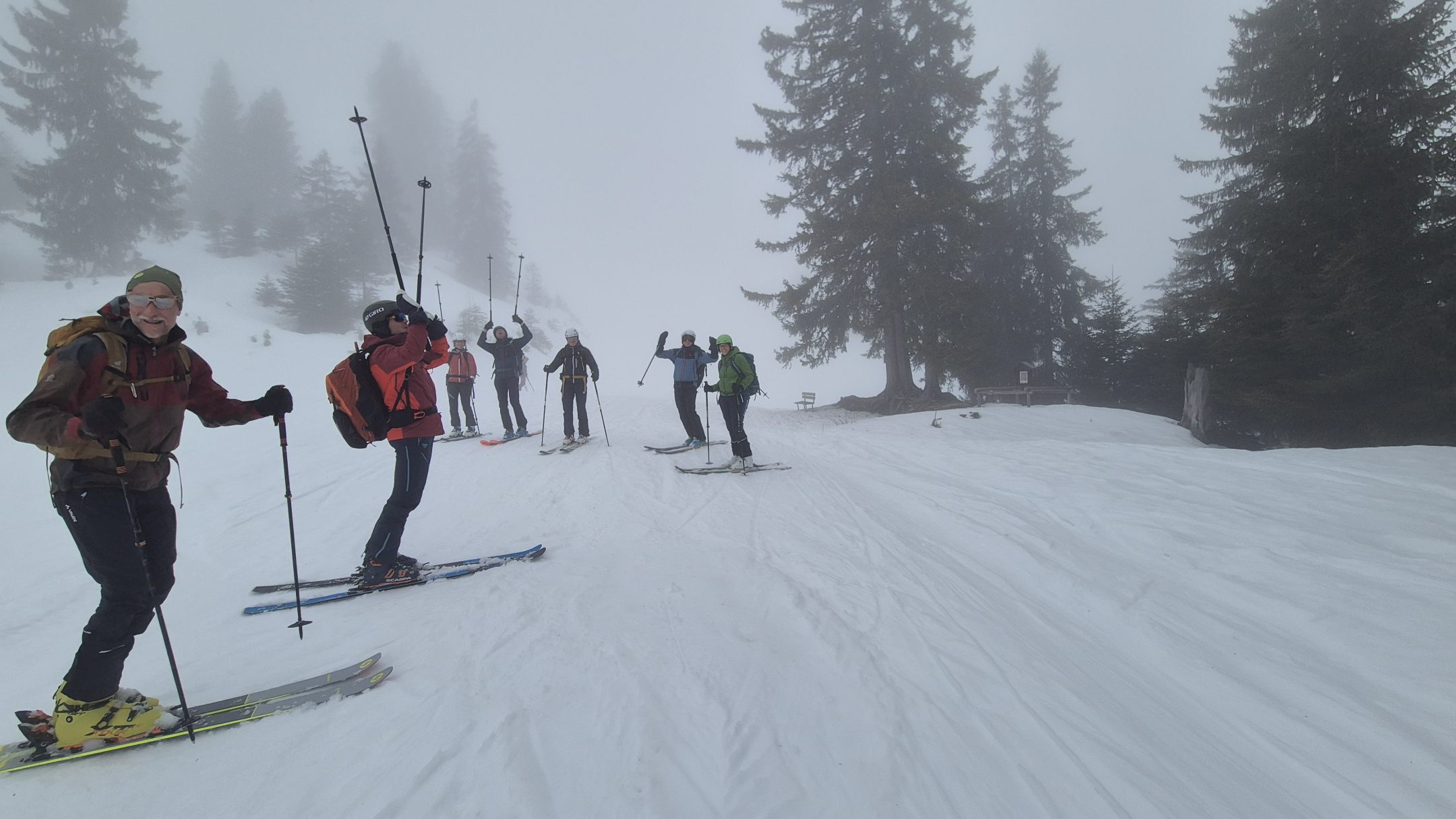 Am Sonntag stand neben dem Tourenerlebnis auch der Ausbildungsaspekt im Mittelpunkt. An der Krinnenspitze im Tannheimer Tal nutzten wir neblige Bedingungen gezielt für ein Training zur Spuranlage im Gelände. Dabei konnten verschiedene Techniken ausprobiert und gemeinsam reflektiert werden – eine wertvolle Erfahrung für zukünftige Touren.