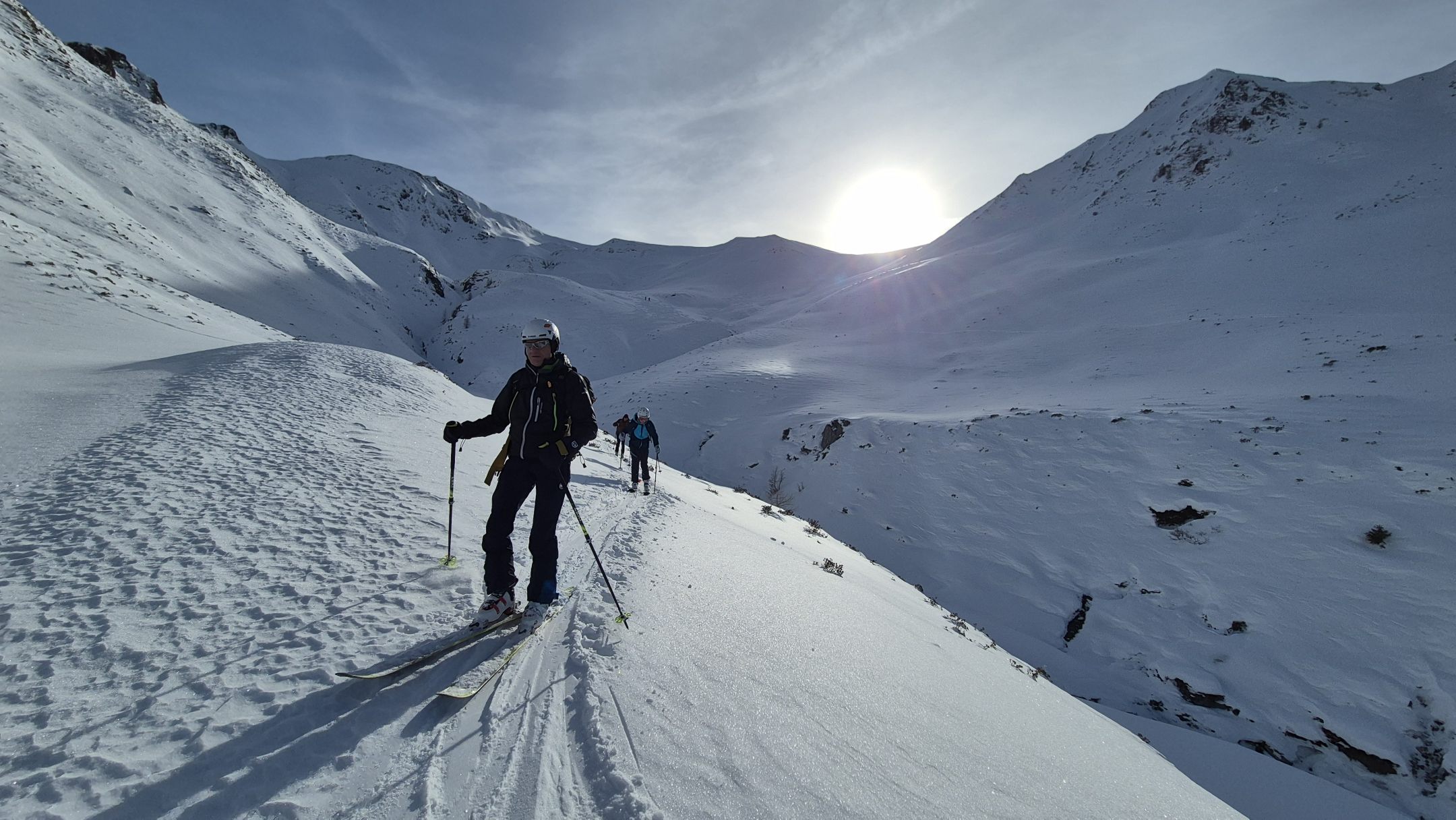 Neben dem sportlichen Erlebnis lag ein klarer Schwerpunkt auf der Lawinenkunde. Gemeinsam beschäftigten wir uns mit dem Lawinenlagebericht, der Interpretation von Gefahrenstufen und der Übertragung auf das konkrete Gelände. Unterwegs wurden immer wieder Stopps eingelegt, um Entscheidungen zur Spurwahl, Hangneigung und Exposition bewusst zu diskutieren.