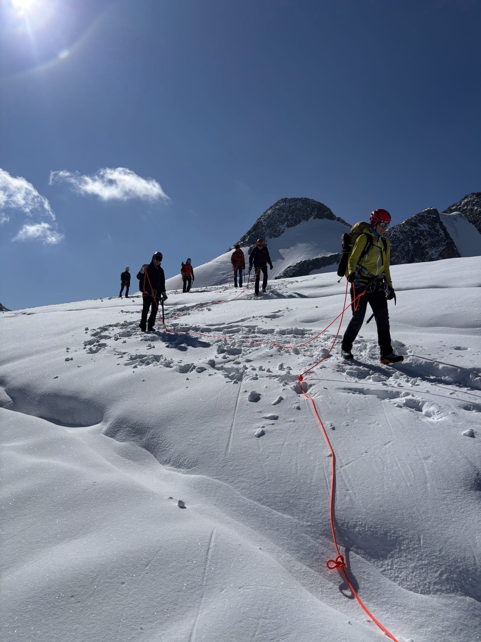 Von der Dresdner Hütte starteten wir frühmorgens zum Gletscher, wo wir angeseilt und mit Steigeisen den Aufstieg über das teils aper gewordene Eis wagten. Der Gipfel des Wilden Freiger belohnte uns mit einem atemberaubenden Panorama auf die Stubaier und Südtiroler Bergwelt.