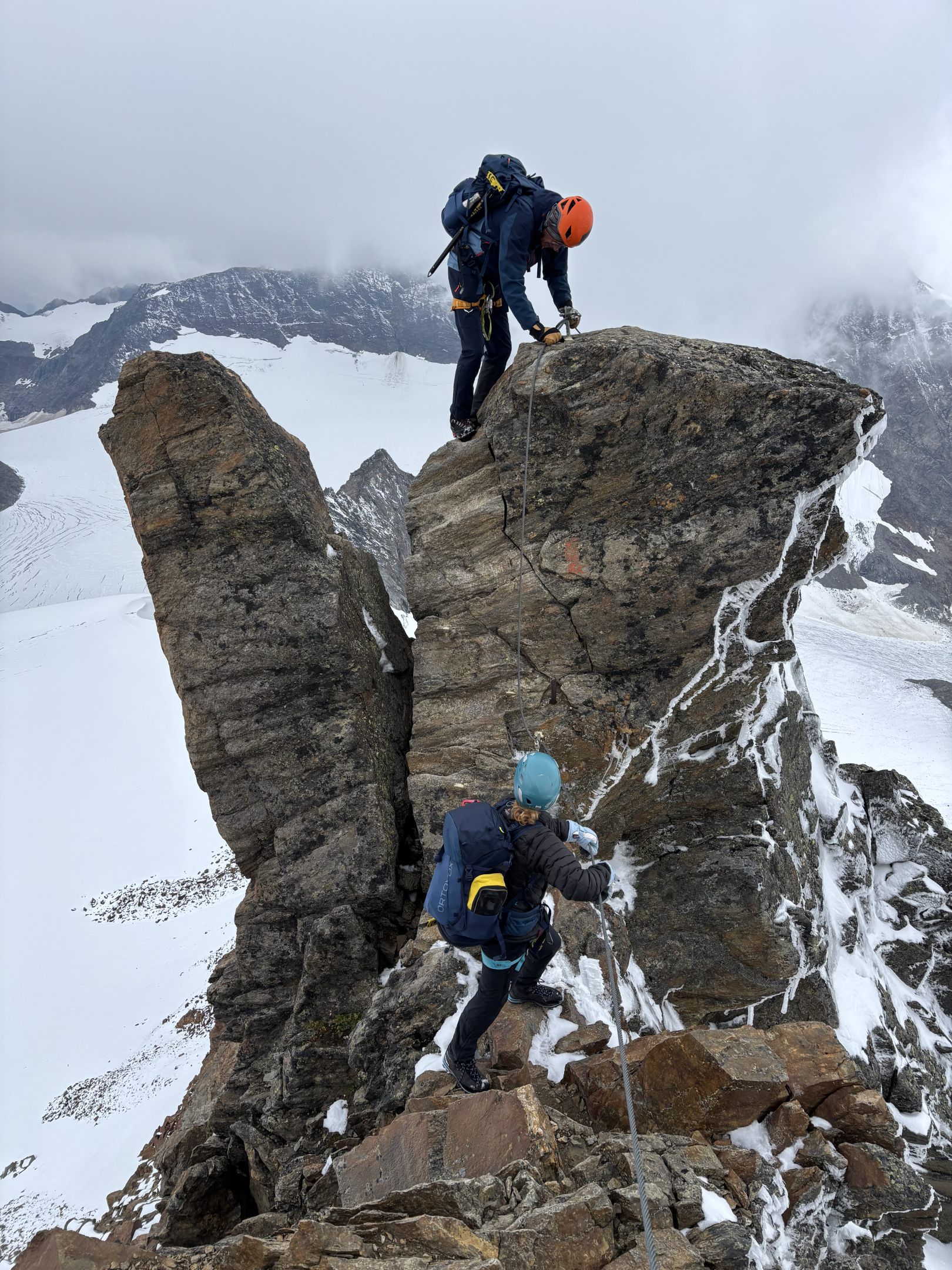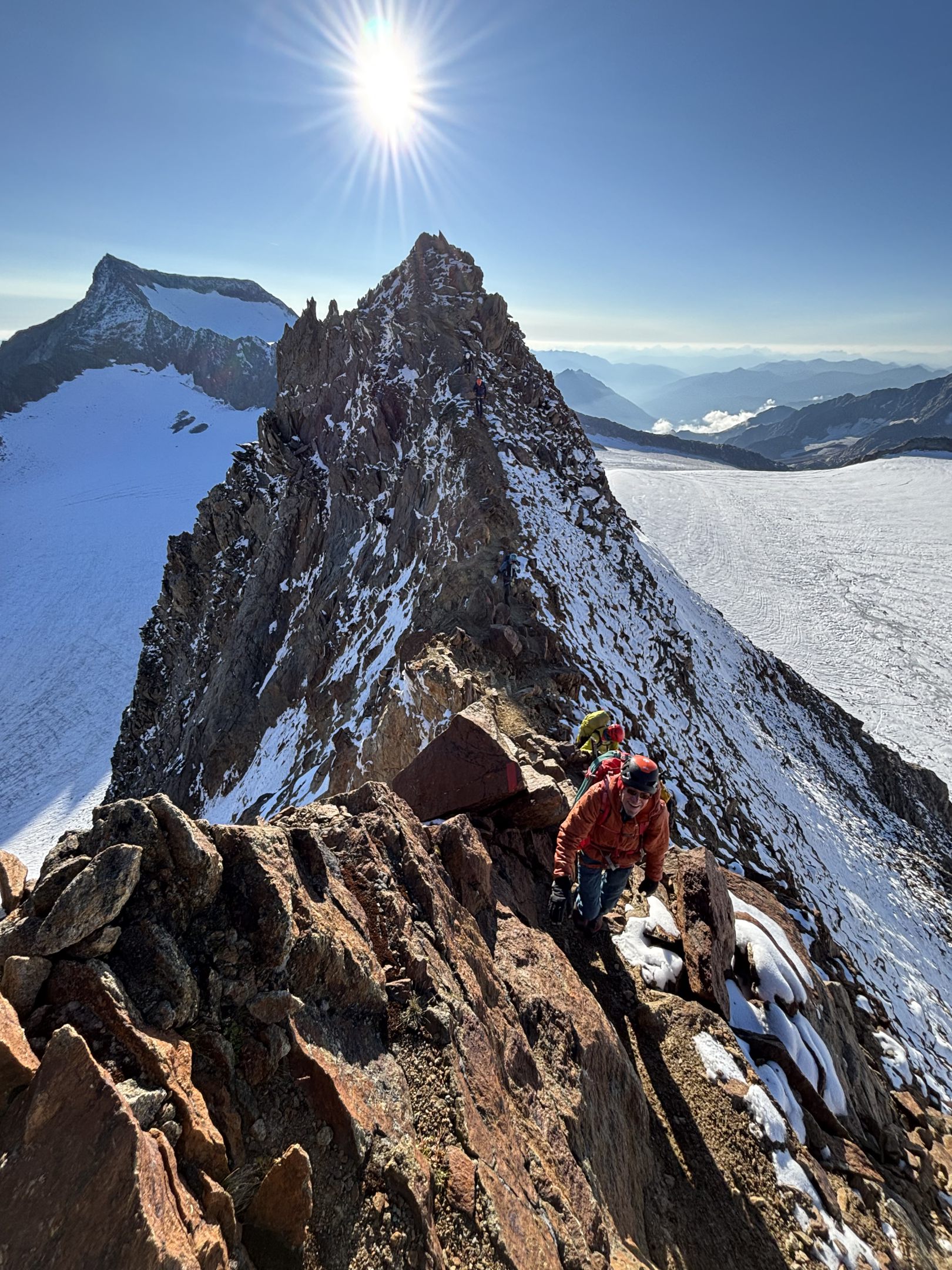 Nach dem Abstieg über Firnfelder und Blockgelände erreichten wir am Nachmittag die Müllerhütte – ein Ort für alpine Gemütlichkeit und Austausch. Der Übergang zum Wilden Pfaff am nächsten Tag führte über einen eindrucksvollen Grat mit festen Felsstrukturen und teils ausgesetzten Passagen. Der Gipfelanstieg war technisch unschwierig, doch der Ausblick auf Zuckerhütl und Wildspitze war schlicht überwältigend.